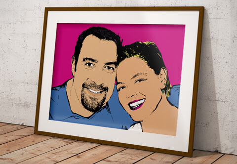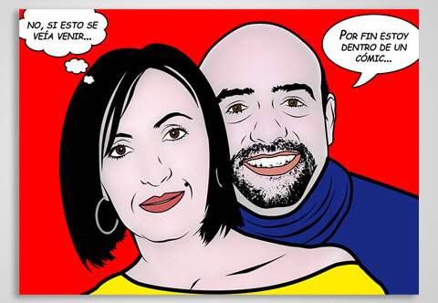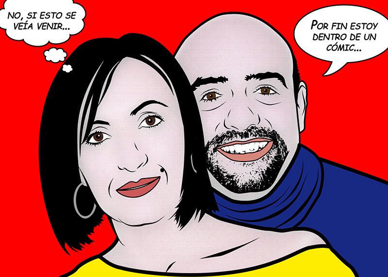 Retratos pop art personalizados individuales o en parejas siguiendo el estilo del genial artista y creativo Roy Lichtenstein. Mándanos tus fotos favoritas, elige el tamaño y en muy poco tiempo tendrás un auténtico retrato Lich en tu poder.